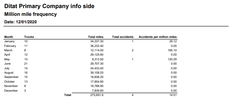 This report will show a monthly breakdown of how many trucks ran and total miles with the total number of accidents and accidents per million miles.