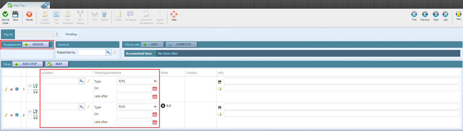 Begin to build the trip by adding locations through the directory or by adding new locations just as you would for a traditional load. Next, you will need to assign the truck, driver, and trailer you intend to use by selecting the "assign" tab: