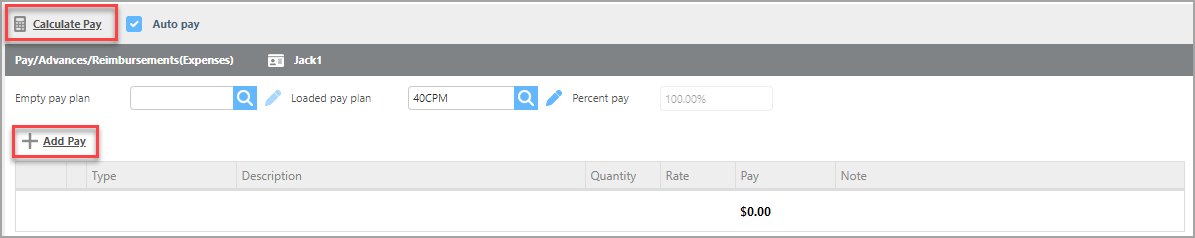 Set up pay – Under the Stops section, click Calculate Pay. A pay plan will be auto-populated if one is assigned to the driver, or you can manually select or enter a pay plan. Additional pay lines for lumpers, stops, or layovers can be added using Add Pay. Advances and expenses can also be added in this section.
