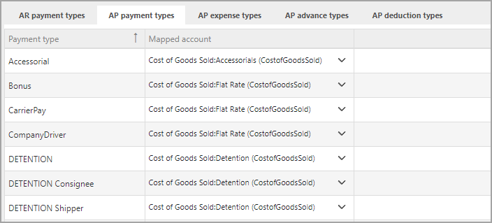 Select the tab for the AR payment types mapping.