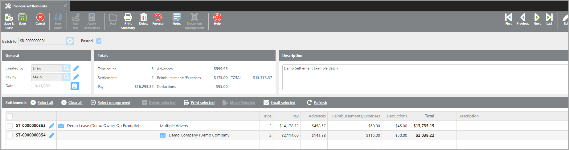 Date | The date the batch uses for deduction calculations. This date also limits which trips can be added — a trip's final check call must be on or before this date to be available for settlement. |