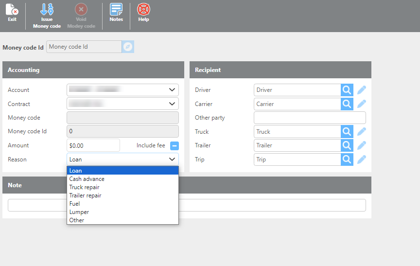 Reason | Select the purpose of the money code. Each option will highlight the corresponding fields in the Recipient section that are required. |