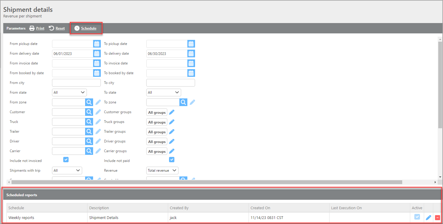 To schedule a report, use the Schedule Report box at the top of the parameters page. Once a report is scheduled, it will appear in a list at the bottom of the screen, where you can also edit the parameters used for each scheduled run.
