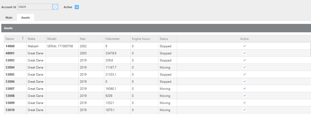 Displays a list of assets in the Spireon system, including make, model, year, odometer reading, and active status.