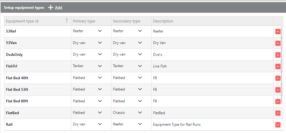 A User can add equipment types to the directory by clicking the Add button. The user can then enter the Equipment Id, select the types of Equipment that this type can work for, and a Description. A user can edit the description of an equipment type by clicking once in the description box and changing the entry.