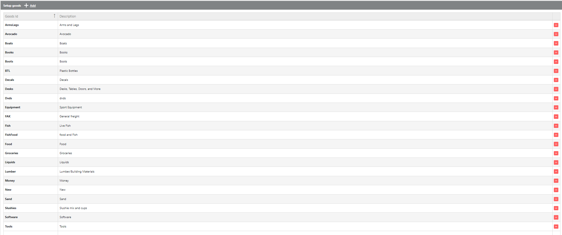 To add a new good, click the Add button, then enter the Goods ID and description.