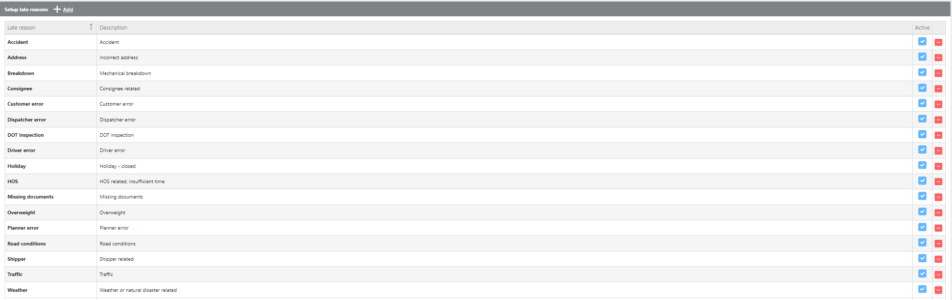 Use this tool to create and maintain a directory of late reasons that can be applied to check calls and trips throughout the system.