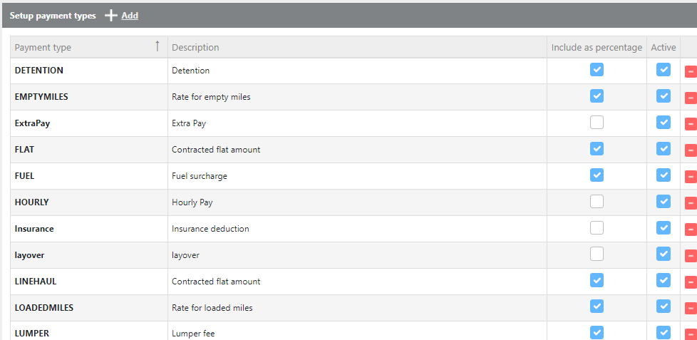 Include as percentage | Check this box to include this payment type in the pay calculation for percentage-based drivers. |