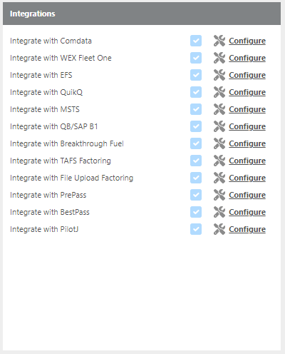 Integrate with Comdata | Integration must be enabled by Ditat. If interested in details or pricing for integration please email support@ditat.com. If integration is enabled click the Configure box to set up the integration. |