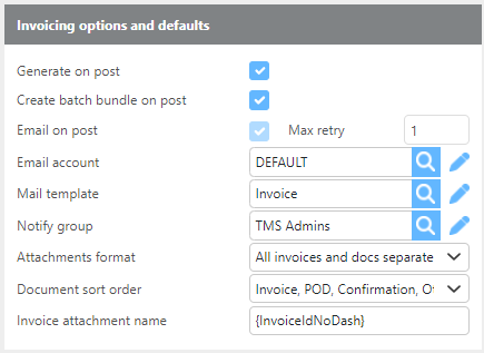Invoice attachment name | Enter the Tag for the naming convention to use on attachments for emails. |