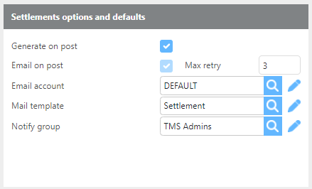 Notify group | Select the group of users that will be emailed If an emailing settlements error occurs. |
