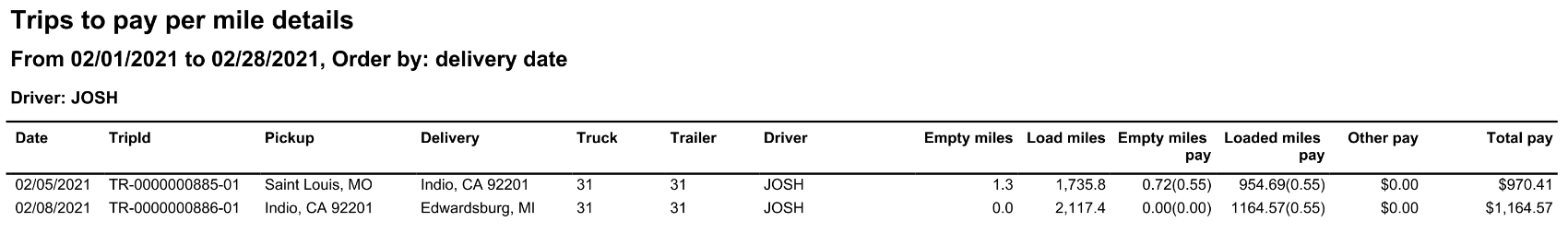 This report displays a list of trips that need to be paid for truck-side drivers paid by mileage.