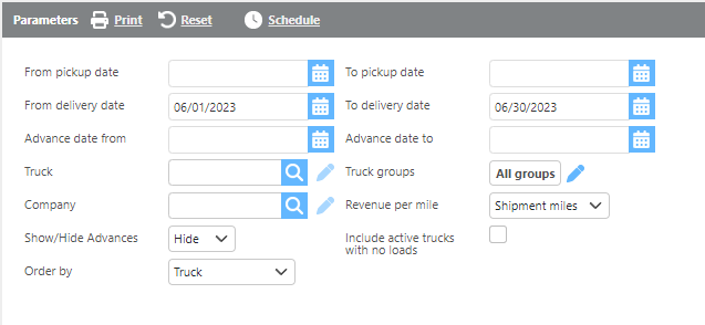 Note: The Fuel, Tolls, and Other Advances columns will only be populated if an advance date range is selected in the report parameters. For advances to display, the truck must be linked on the advance and the Truck checkbox must be checked on the advance.