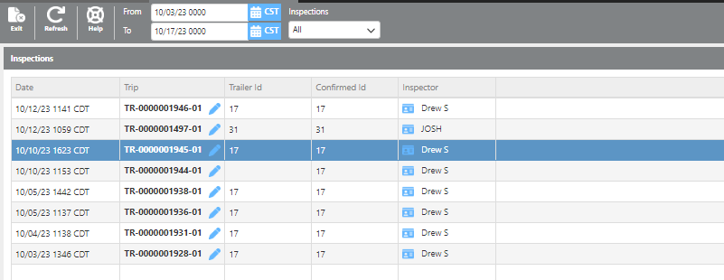 Inspection Specification | Select how to filter inspections: All displays both confirmed and unconfirmed inspections. Without Trailer lists inspections that still require a trailer to be confirmed. Specific Trailer displays inspections that have already been confirmed to a trailer. |
