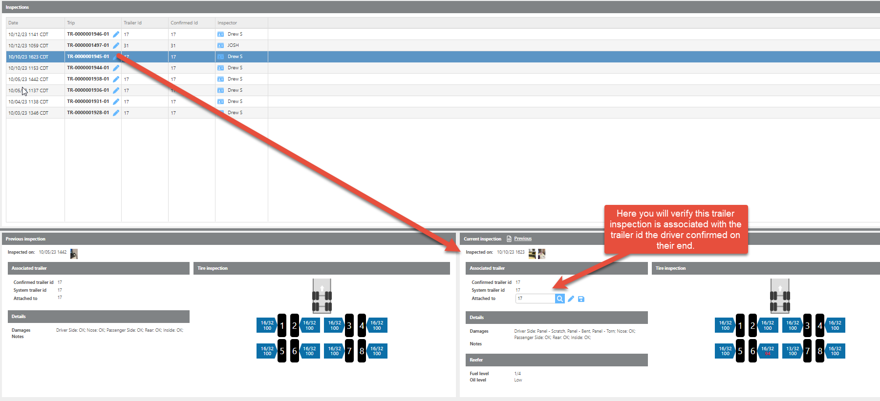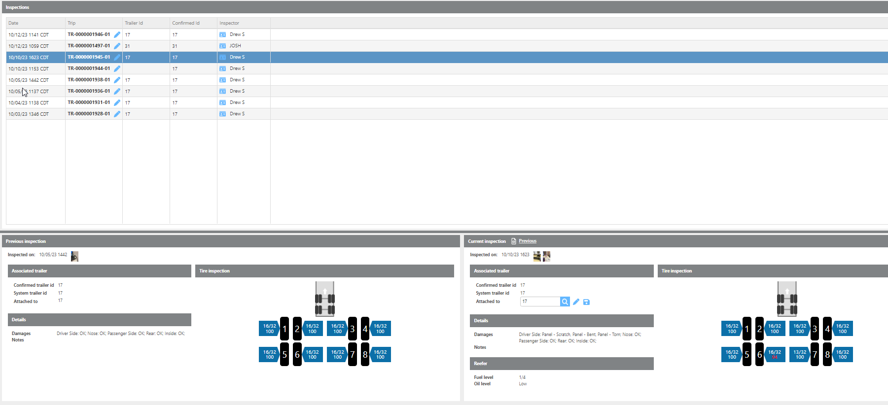 If a Specific Trailer is selected, choose a trailer and click Refresh to load all inspections linked to that trailer. Selecting an inspection will display the current inspection in the lower right panel, with the previous inspection shown to its left.